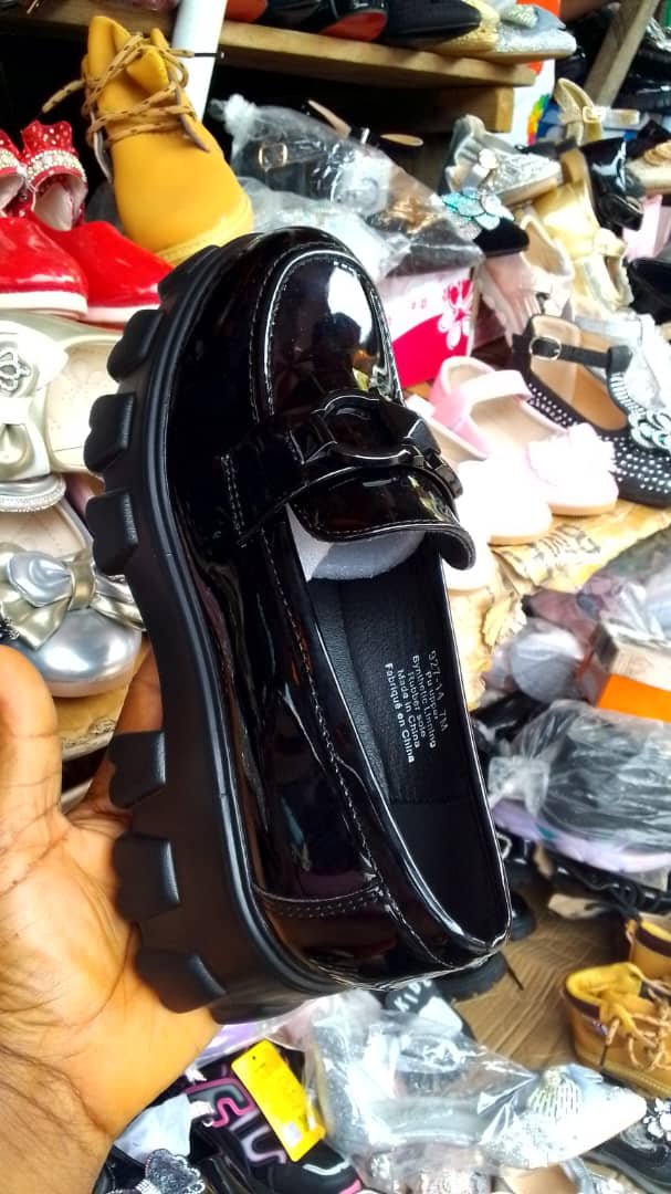 Trendy ladies black flat shoes designed with a chunky sole for extra comfort and durability. Featuring a glossy finish and classic loafer style, these shoes are perfect for office wear, work, church, meetings, and casual outings.