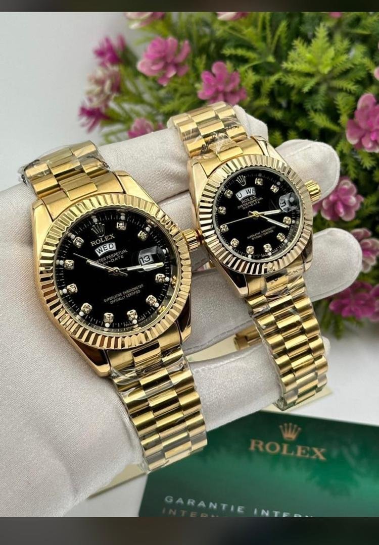 Turn heads with this premium gold couple set, featuring a rich black dial and diamond-style hour markers. Designed for couples who love timeless luxury and everyday elegance.