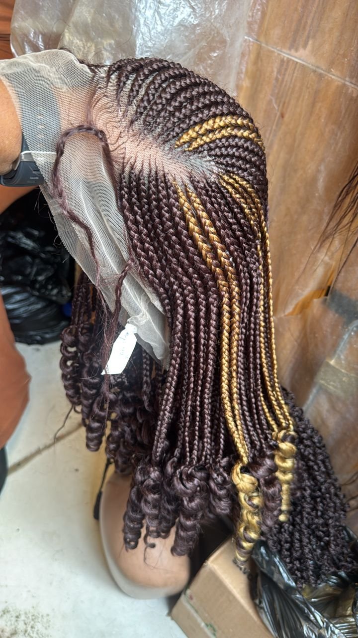 Introducing HoneyBlend Micro Braided Lace Wig—a beautifully crafted hand-braided wig designed for women who love a touch of warmth and uniqueness. The fine micro braids are neatly installed on a soft, breathable lace that blends smoothly with the scalp for a very natural finish.
