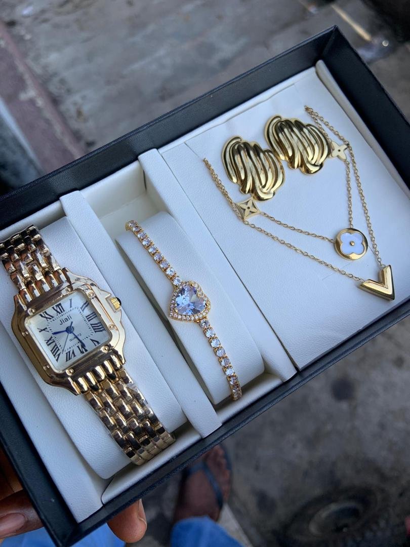 For those who love sophistication — the Lamanda Luxe Box Set includes a luxury-style wristwatch, a crystal heart bracelet, and a minimalist gold jewelry set with earrings and layered necklace.