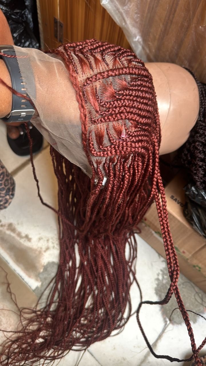 Introducing RubyGlow Micro Braided Lace Wig—a bold yet classy hand-braided wig made for women who love to stand out beautifully. The fine micro braids are neatly installed on a soft, breathable lace base, giving a clean scalp-like finish that looks natural from every angle.