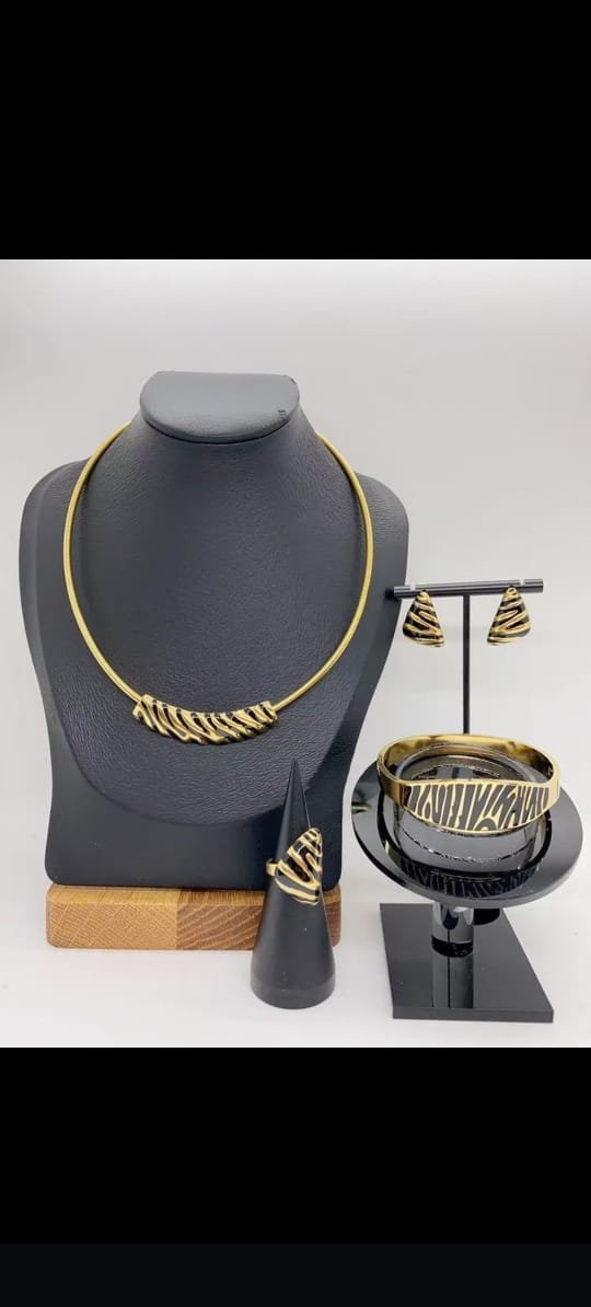 Channel bold sophistication with this zebra-striped black and gold set — including necklace, earrings, bracelet, and ring. The perfect combination of art and edge for the modern woman.