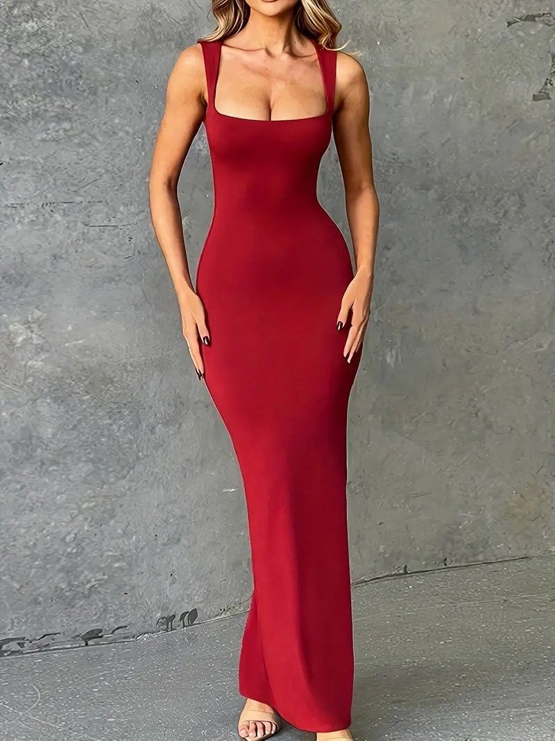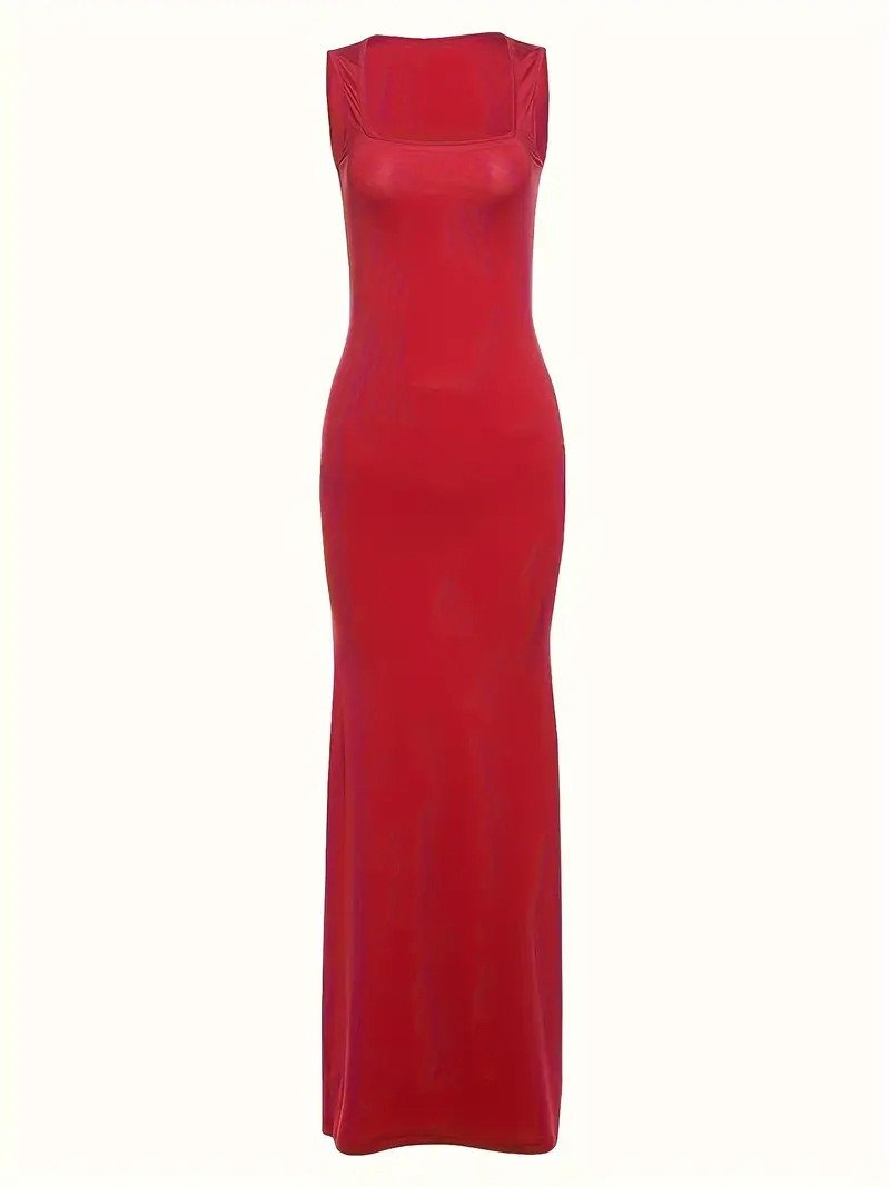 Solid Square Neck Tank Dress, Elegant Sleeveless Bodycon Maxi Dress For Party & Banquet, Women’s Clothing