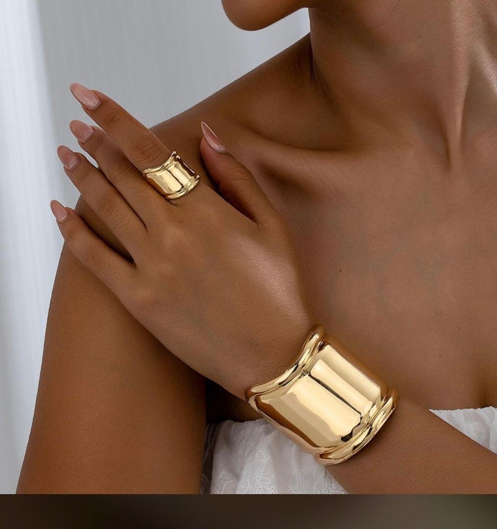 Command attention with this bold gold cuff bracelet and ring set — a true statement of empowerment and elegance. Its mirror finish and smooth curves make it a luxury accessory for modern fashion lovers.