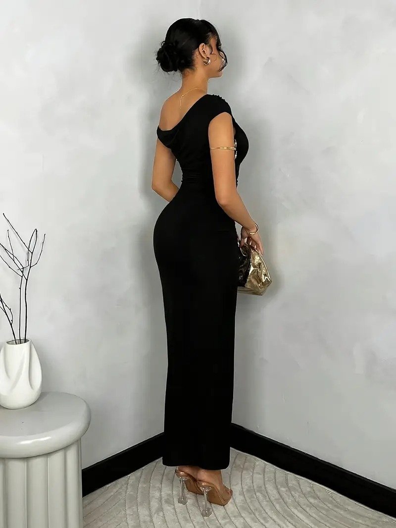 Women’s Elegant Asymmetric Neckline Ruched Bodycon Dress, Solid Color, Long Sleeveless, Polyester & Spandex, Spring/Summer/Autumn, Slim Fit, Backless, Adult Size, Knitted Fabric
